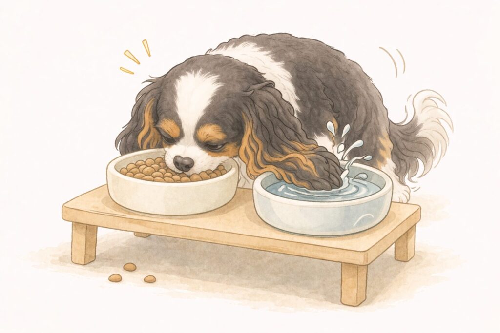 キャバリアは食べ方が激しく、 フードと水を台の上に並べたら、 長い耳が水に浸かってベタベタになってしまいました。 フードだけ別の場所に置き、水だけ台の上に残したところ、 むせることなく飲めるようになりました。