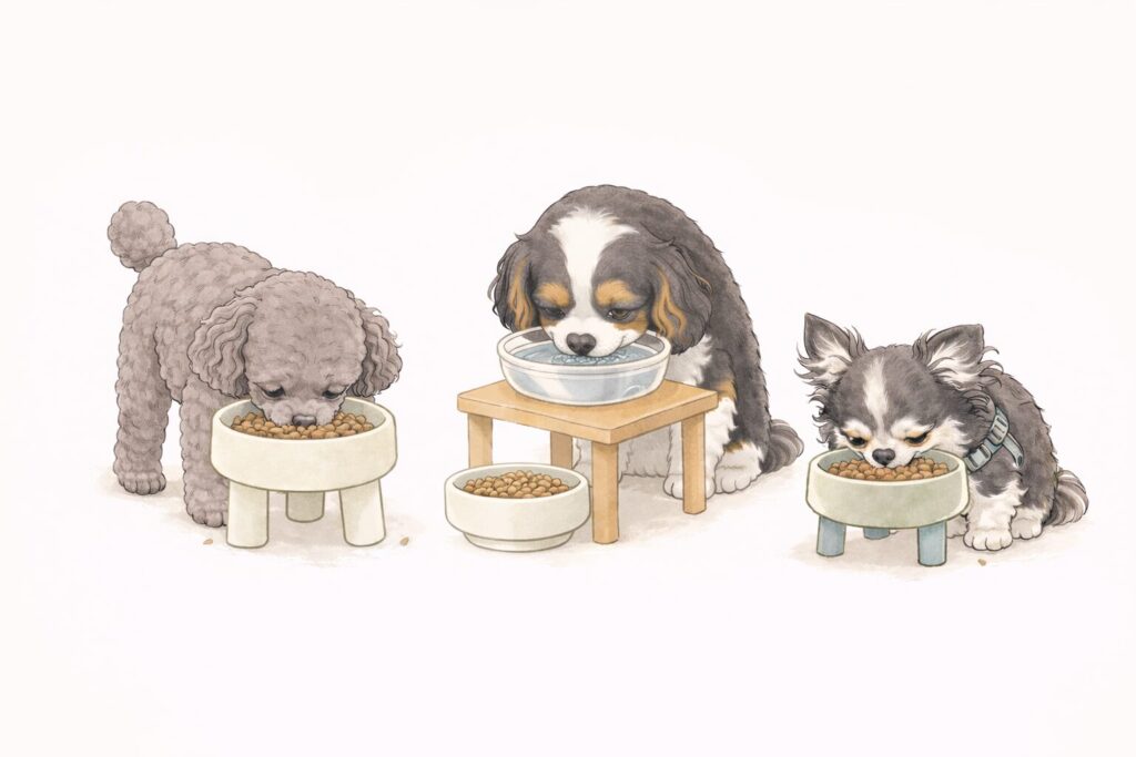 トイプードルとキャバリアは若い頃、 早食い防止のフードボウルを使っていた時期もありましたが、 歳をとってからは早食い防止より、 食べやすい位置に整えることの方が大切でした。