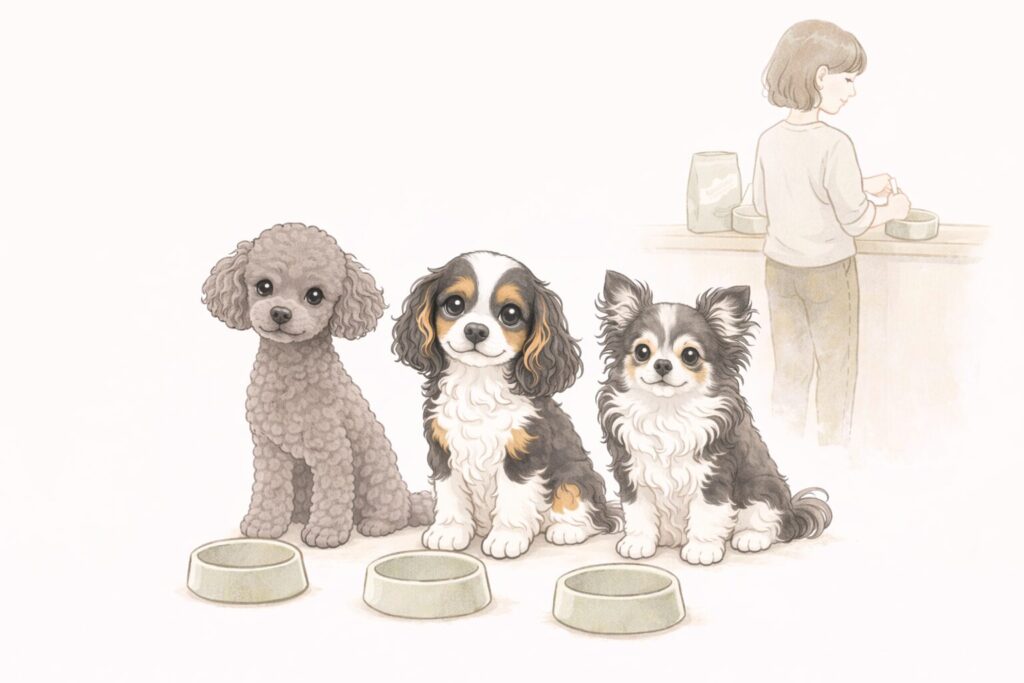 また、体調や食欲の状態によっては、 1日3回程度に分ける方法が適している場合もあります。 我が家でも、下痢が続いたときには、 便の様子を見ながら少量ずつ与えるようにしました。