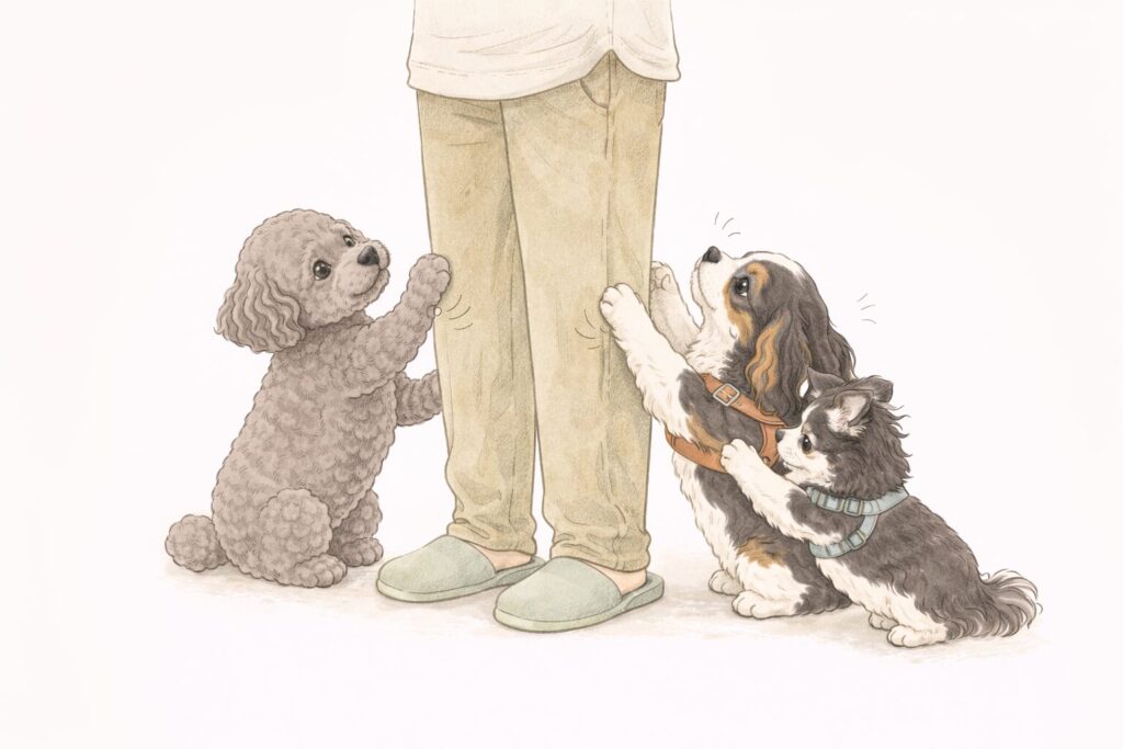 我が家のトイプードル・キャバリア・チワワの3頭は、 食事の時間が近づいてくると 「そろそろですよね」と訴えにきます。 私が他のことに気を取られていると、 チョンチョンと手を伸ばしてきたり、 足にまとわりついたり、膝に乗ってきたりします。