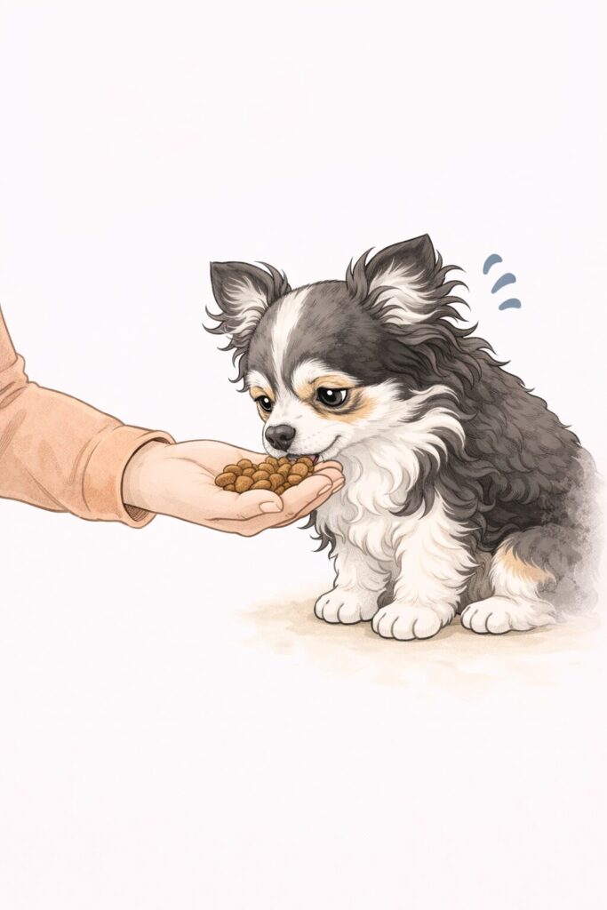 いつもは、他の子に取られないように大急ぎでフードを食べるチワワが